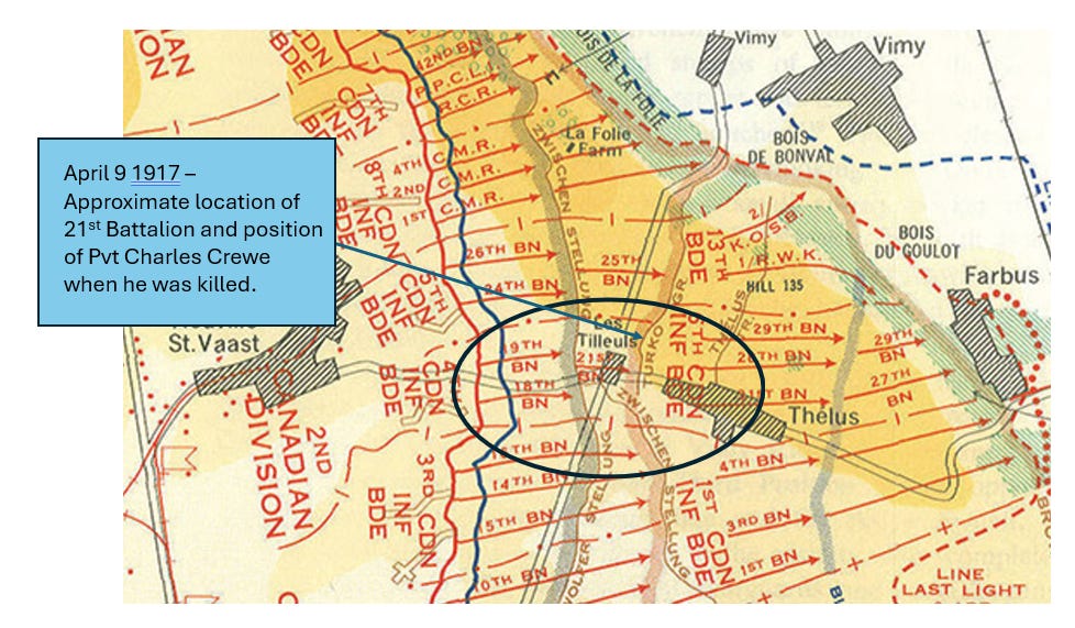 This is the most amount of information we have available on the loss of Private Charles Crewe. His casualty record details that near the village of Thelus, he was struck down by enemy machine gun bullets. As his body was not recovered, these details cannot be collaborated. There is a good chance that surviving members of his platoon relayed this information along to their Sergeant and onto the Battalion Adjutant, however we will never truly know. What is certain is that in the hours and days following the attack, while the Canadians were celebrating their well-earned victory, word slowly and progressively passed along from man to man, unit to unit informing Tommy that his brother Charles counted amongst the missing.